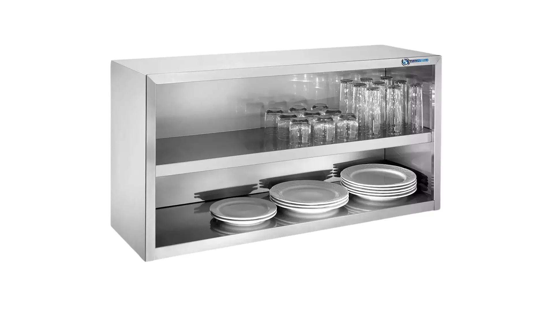 Mueble abierto (sin puertas) de anclar a pared fabricado en lámina de acero inoxidable Ref 430 calibre 20. Presenta entrepaño en acero inoxidable con refuerzo omega en la parte inferior.