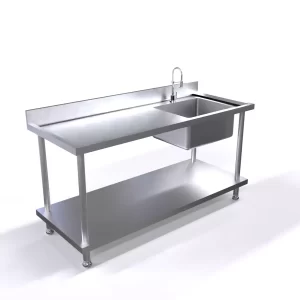 Cubierta fabricada en lámina de acero inoxidable 304 calibre 20. Cuerpo fabricado en lamina de acero inoxidable Ref 430 Cal.20. Presenta salpicadero posterior de 10 cm y refuerzo omega en la parte inferior. Presenta puertas corredizas y entrepaño en lámina de acero inoxidable ref 430 cal 20, niveladores de piso. Incluye poceta de 40x40x20 cms. No Incluye grifería