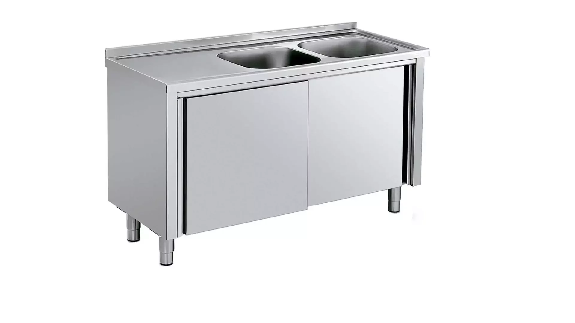 Cubierta fabricada en lámina de acero inoxidable 304 calibre 20. Cuerpo fabricado en lamina de acero inoxidable Ref 430 Cal.20. Presenta salpicadero posterior de 10 cm y refuerzo omega en la parte inferior. Presenta puertas corredizas y entrepaño en lámina de acero inoxidable ref 430 cal 20, niveladores de piso. Incluye 2 pocetas de 40x40x20 cms. No Incluye grifería