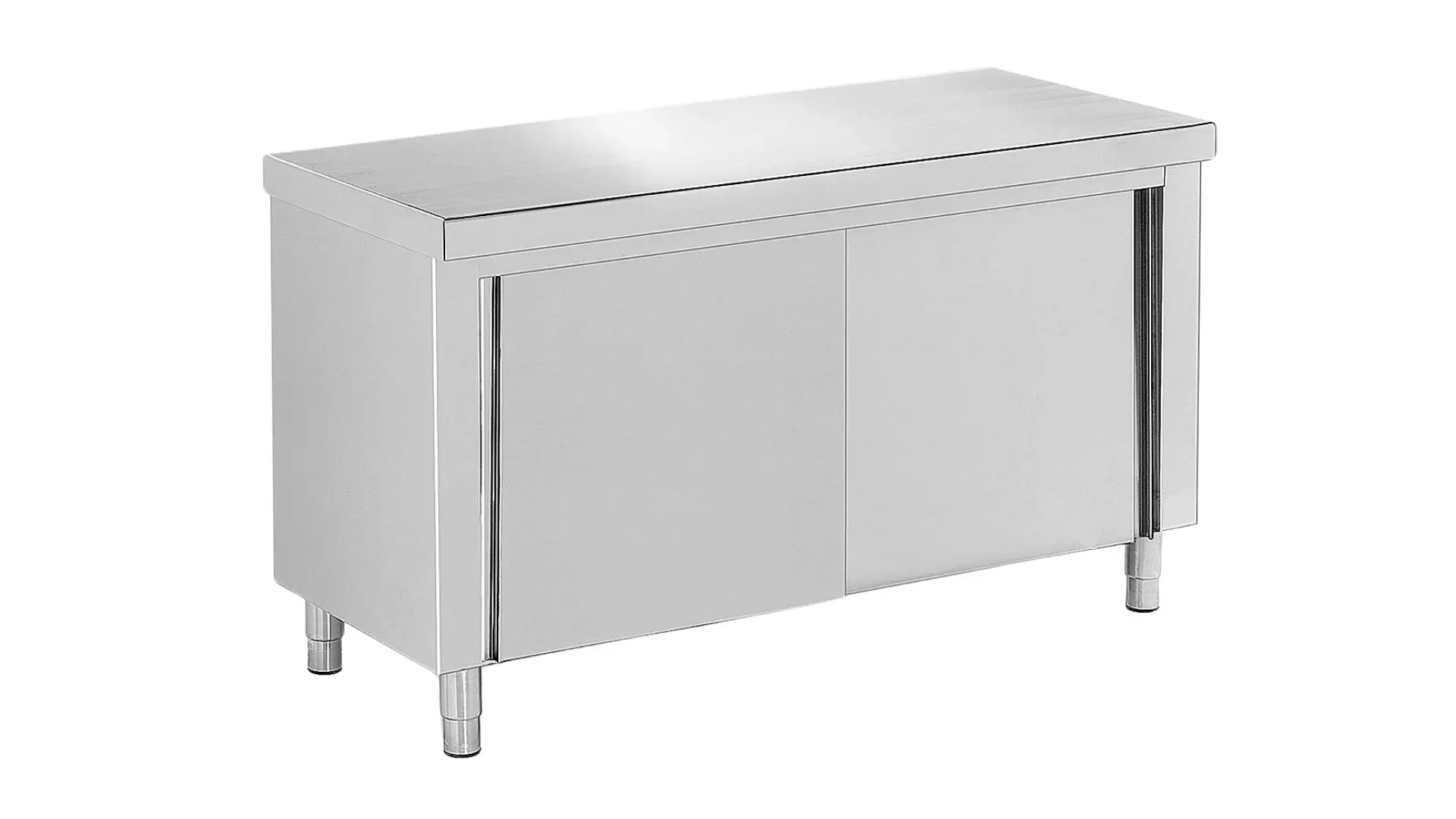 Cubierta fabricada en lámina de acero inoxidable 304 calibre 18. Cuerpo fabricado en lamina de acero inoxidable Cal.20. Presenta refuerzo omega en la parte inferior. Cuenta con puertas corredizas y entrepaño en lámina de acero inoxidable Ref 430 cal 20, niveladores de piso
