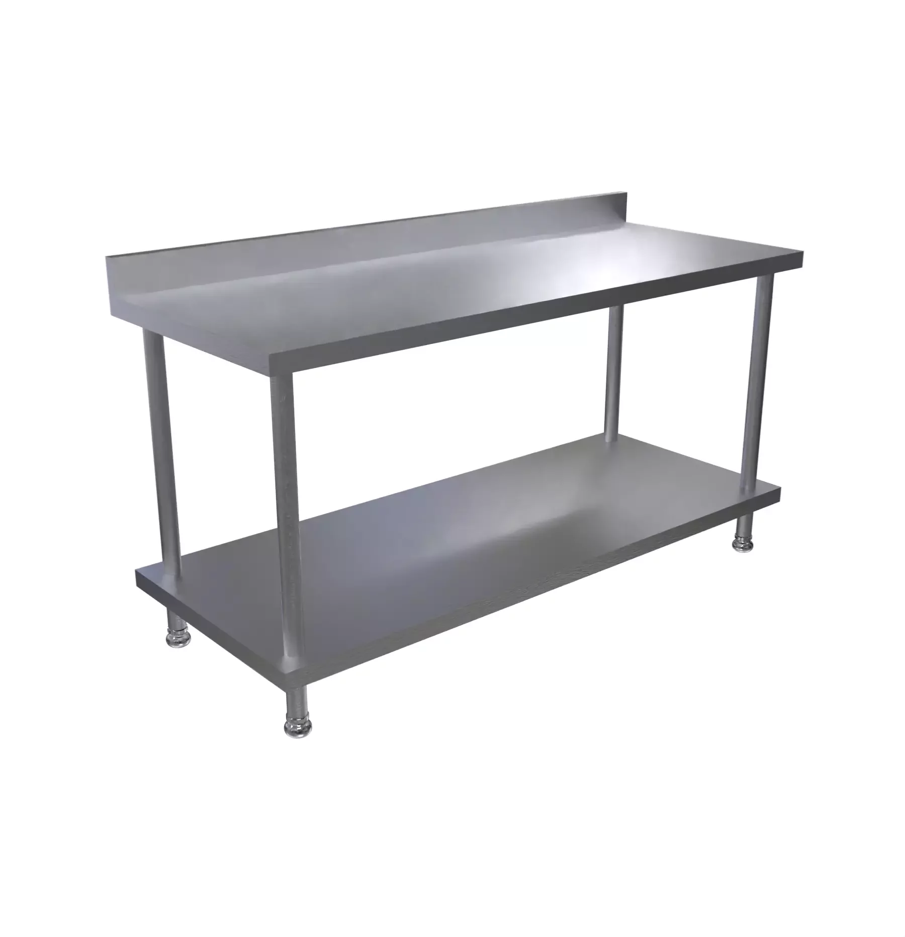 Cubierta fabricada en lámina de acero inoxidable 304 calibre 18 antiácido. Presenta salpicadero posterior de 10cm y refuerzo omega de acero inoxidable en la parte inferior. Patas en tubo de acero inoxidable de 1-1/2 pul. de diámetro. incluye entrepaño en lámina de acero inoxidable cal 20 y niveladores de piso