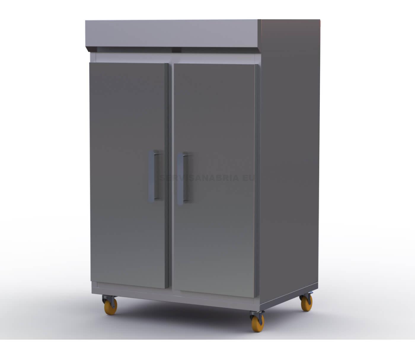 Equipo de refrigeración de un compartimiento; Fabricado en lámina de acero inoxidable cal 20. Aislamiento térmico en inyección de poliuretano de 2” de espesor, sistema de enfriamiento por tuberias, control de temperatura full gauge (0 a 5°C), cuenta con parrillas graduables, puertas en acero, base con ruedas de tipo industrial.